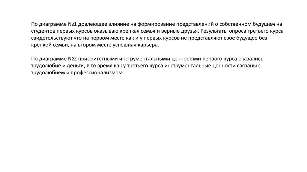 По диаграмме №1 довлеющее влияние на формирование представлений о собственном будущем настудентов первых курсов оказываю крепкая семья и верные друзья. Результаты опроса третьего курса