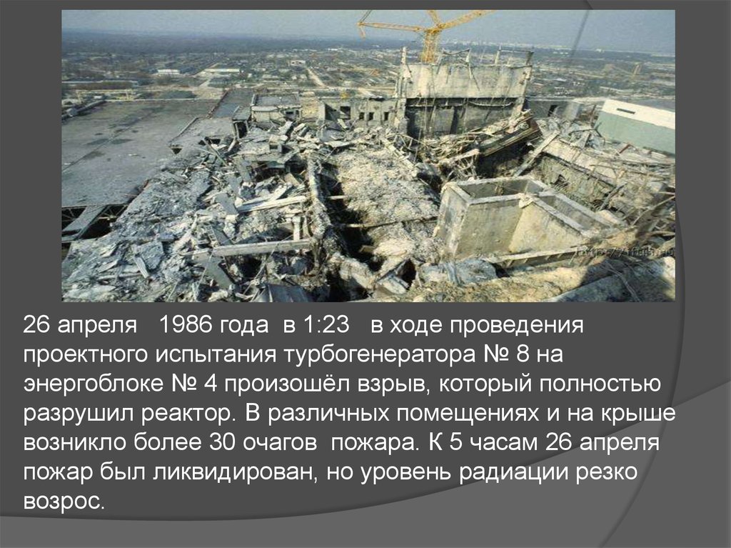 26 апреля 1986 года в 1:23 в ходе проведенияпроектного испытания турбогенератора № 8 на