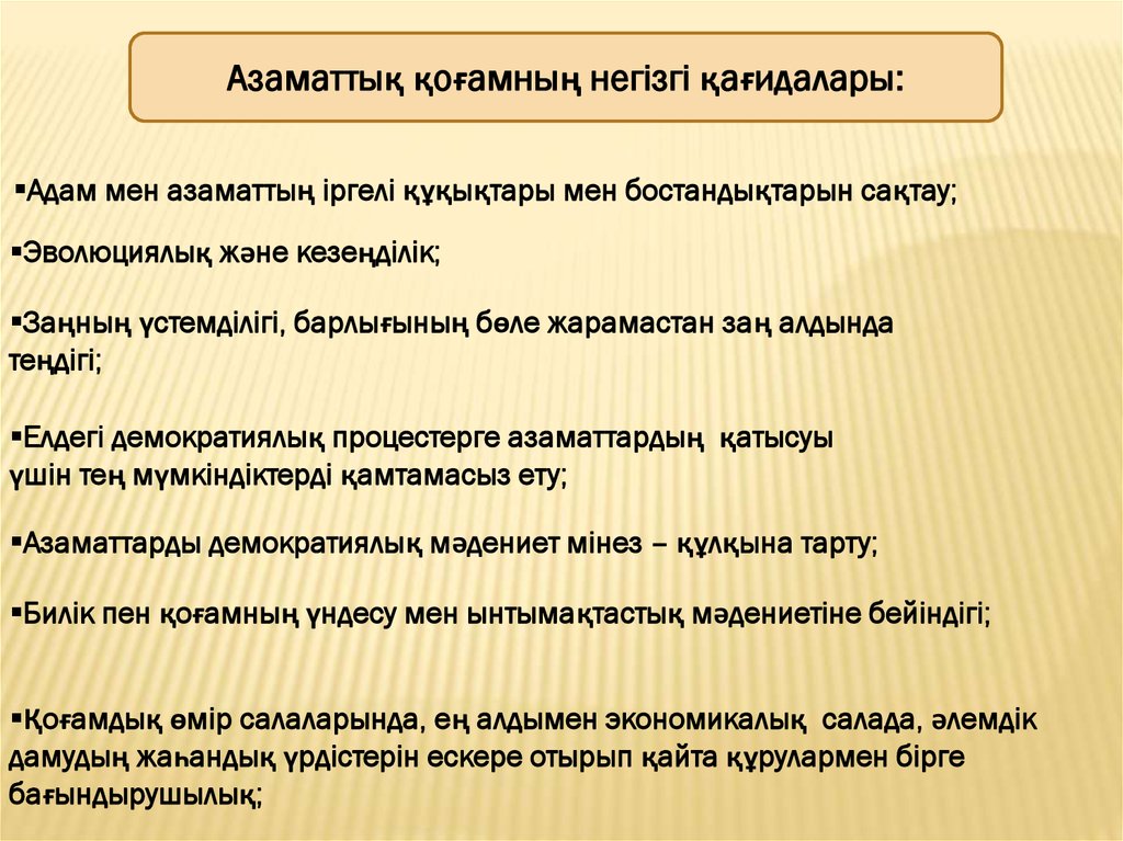 Азаматтық қоғамның негізгі қағидалары:Адам мен азаматтың іргелі құқықтары мен бостандықтарын сақтау;