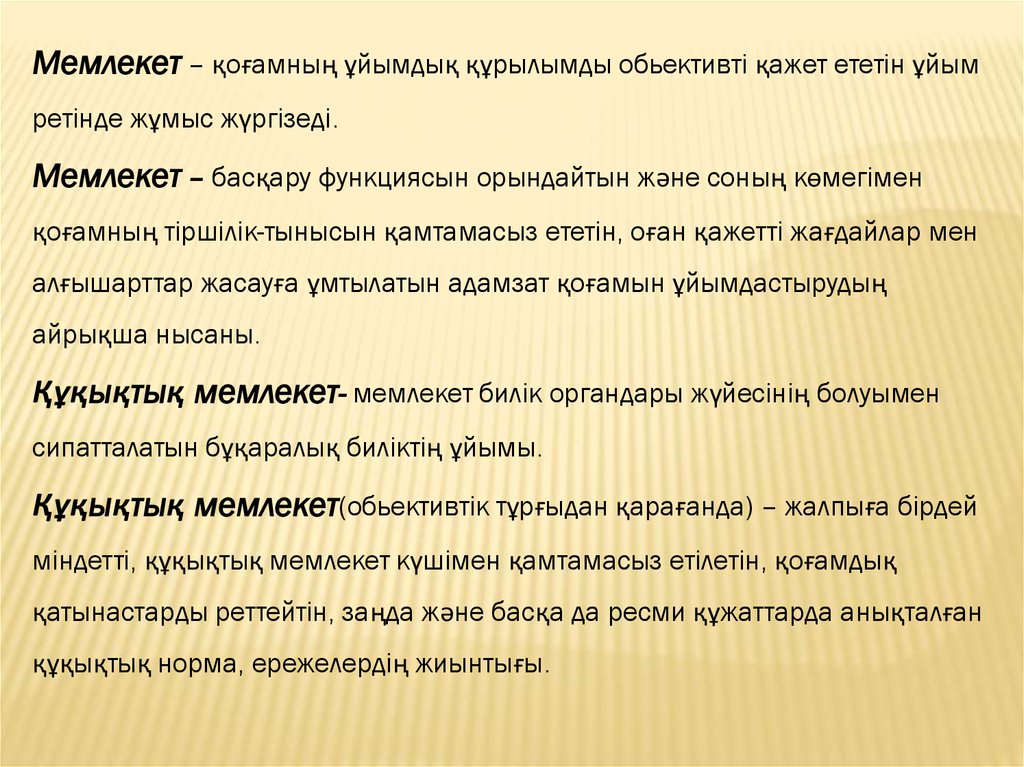 Мемлекет – қоғамның ұйымдық құрылымды обьективті қажет ететін ұйымретінде жұмыс жүргізеді.