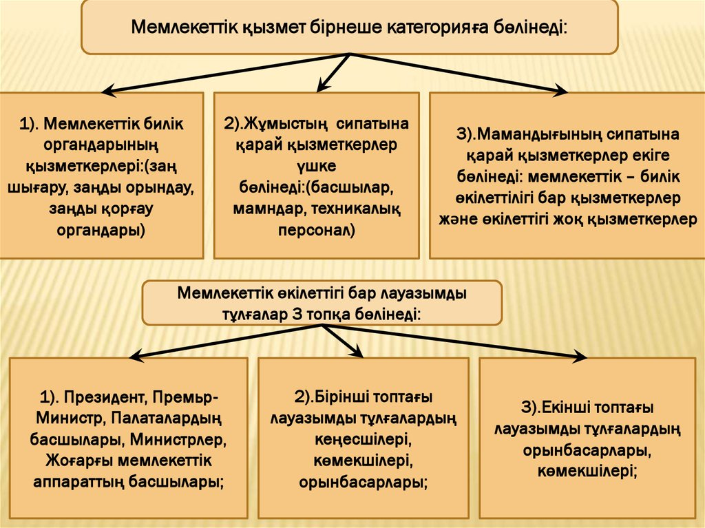Мемлекеттік қызмет бірнеше категорияға бөлінеді:1). Мемлекеттік билік