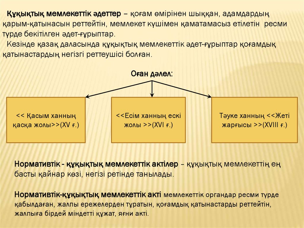 Құқықтық мемлекеттік әдеттер – қоғам өмірінен шыққан, адамдардыңқарым-қатынасын реттейтін, мемлекет күшімен қаматамасыз етілетін ресми