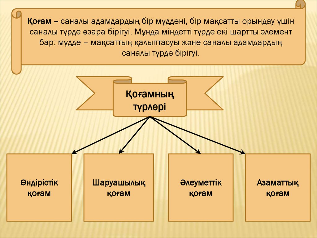 Қоғам – саналы адамдардың бір мүддені, бір мақсатты орындау үшінсаналы түрде өзара бірігуі. Мұнда міндетті түрде екі шартты элемент