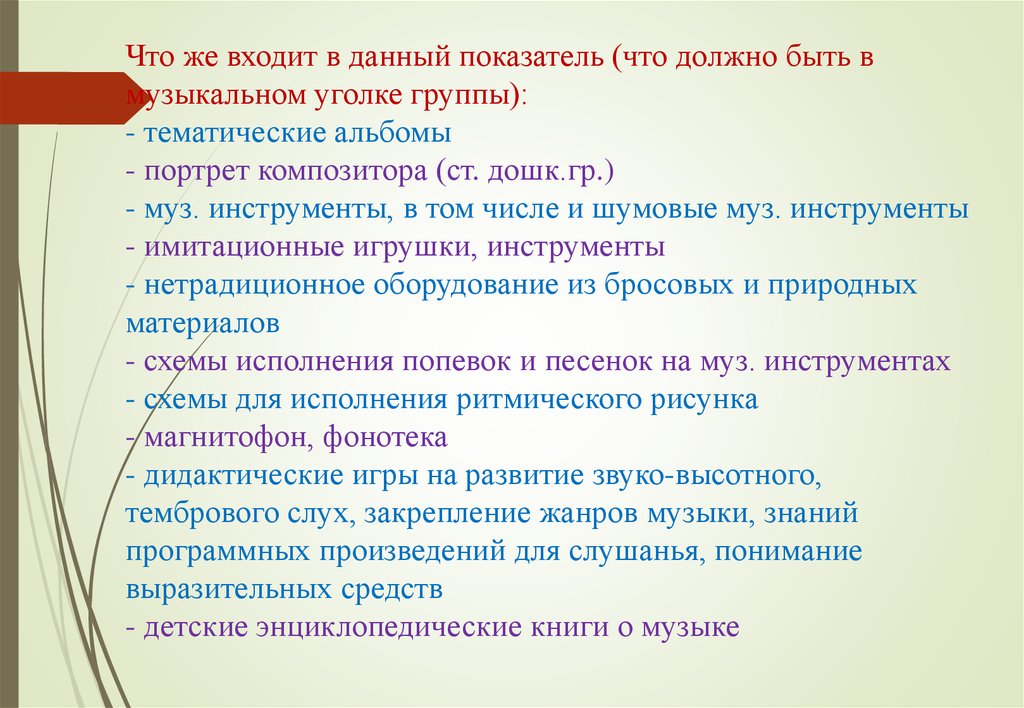 Что же входит в данный показатель (что должно быть вмузыкальном уголке группы):