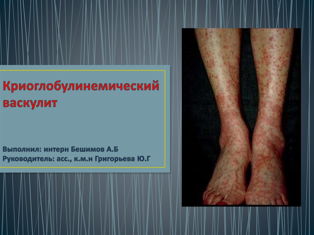 1. Криоглобулинемический васкулит Выполнил: интерн Бешимов А.Б Руководитель: асс., к.м.н Григорьева Ю.Г