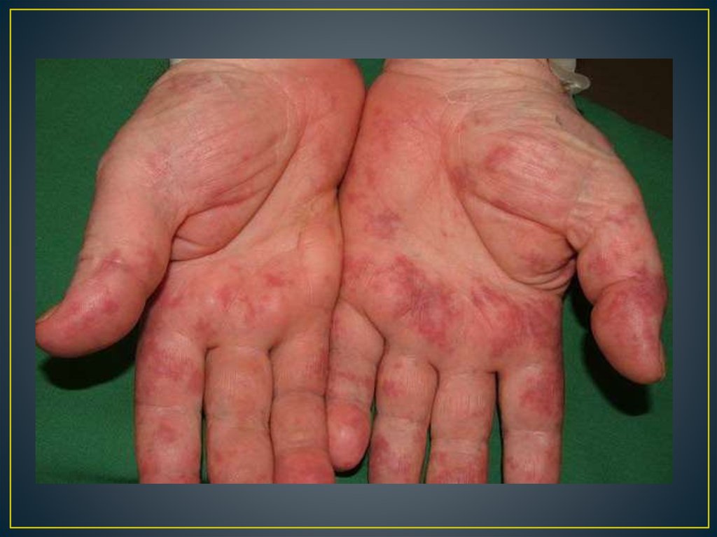 • Характерны также симметричные, мигрирующие полиартралгии, приэтом чаще поражаются проксимальные межфаланговые, пястнофаланговые и коленные суставы, значительно реже – голеностопные и