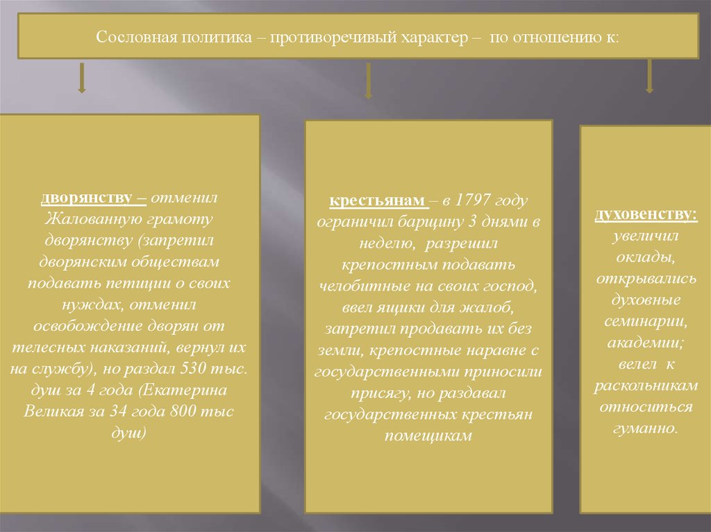 Сословная политика – противоречивый характер – по отношению к:дворянству – отменил