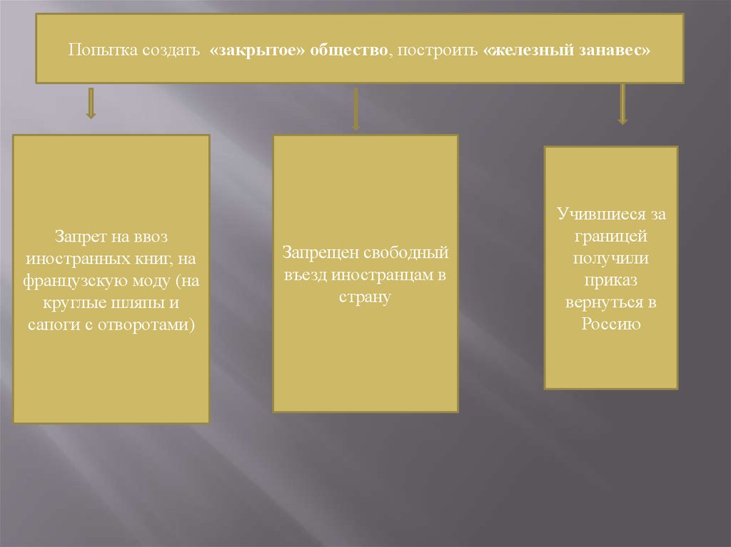 Попытка создать «закрытое» общество, построить «железный занавес»Запрет на ввоз