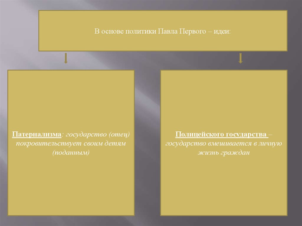 В основе политики Павла Первого – идеи:Патернализма: государство (отец)