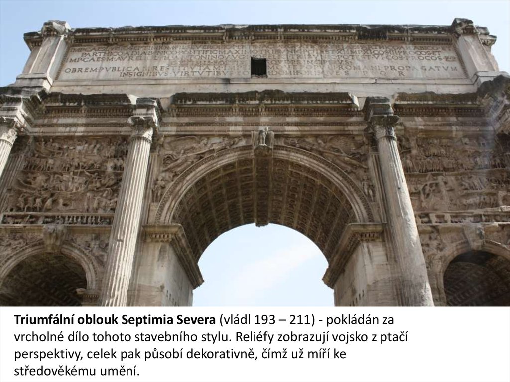 Triumfální oblouk Septimia Severa (vládl 193 – 211) - pokládán zavrcholné dílo tohoto stavebního stylu. Reliéfy zobrazují vojsko z ptačí