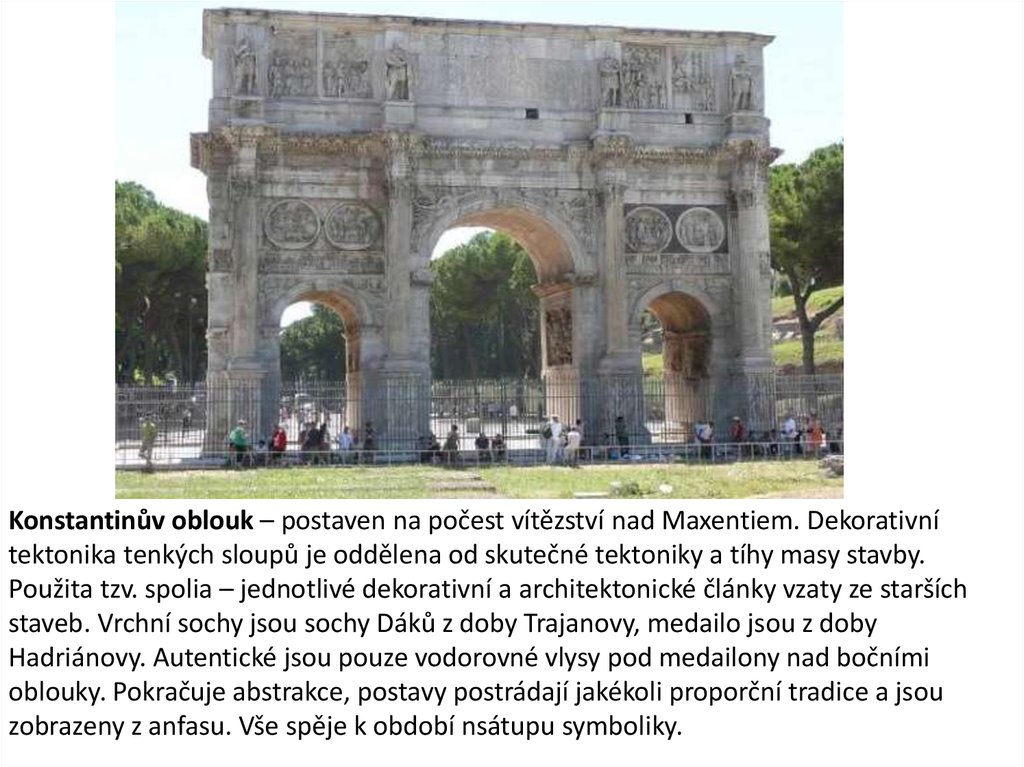 Konstantinův oblouk – postaven na počest vítězství nad Maxentiem. Dekorativnítektonika tenkých sloupů je oddělena od skutečné tektoniky a tíhy masy stavby.