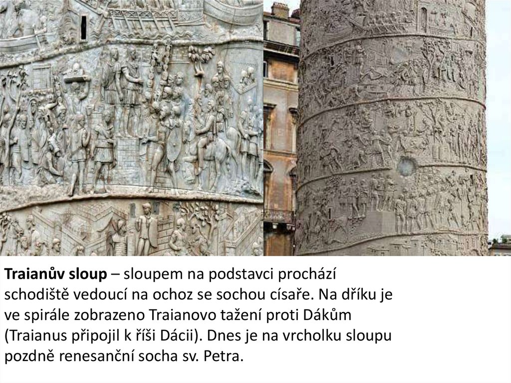 Traianův sloup – sloupem na podstavci procházíschodiště vedoucí na ochoz se sochou císaře. Na dříku je