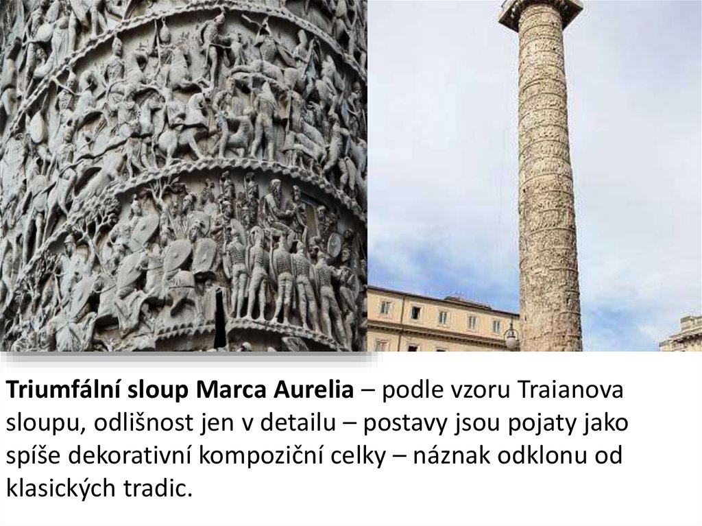 Triumfální sloup Marca Aurelia – podle vzoru Traianovasloupu, odlišnost jen v detailu – postavy jsou pojaty jako