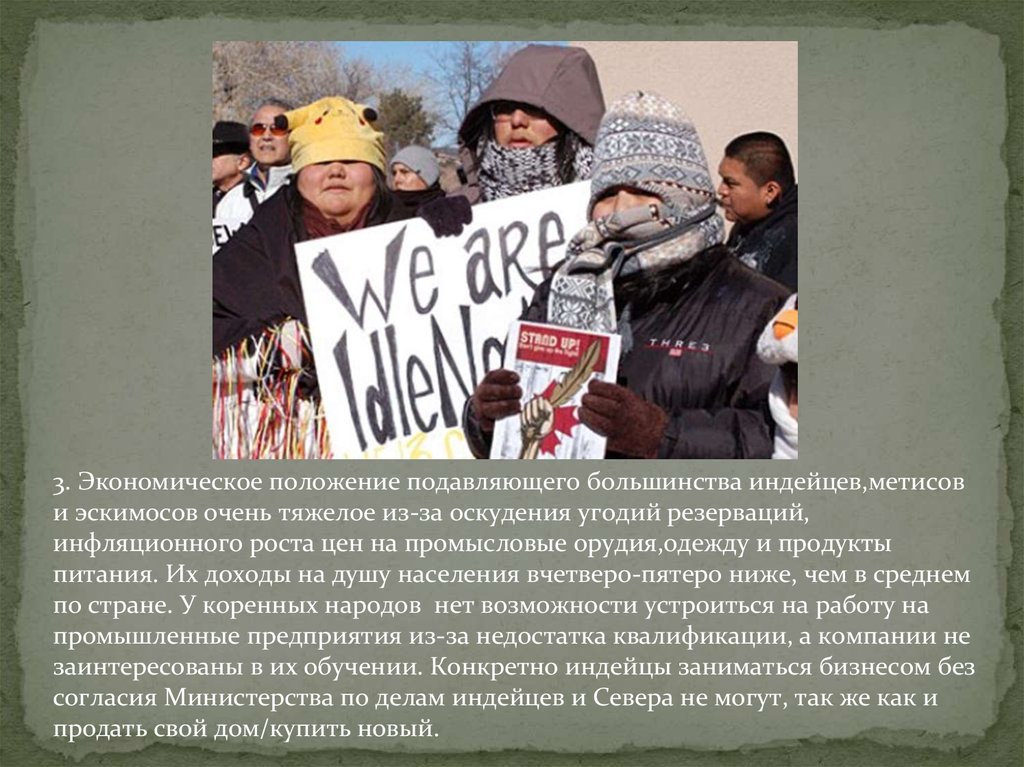 3. Экономическое положение подавляющего большинства индейцев,метисови эскимосов очень тяжелое из-за оскудения угодий резерваций,