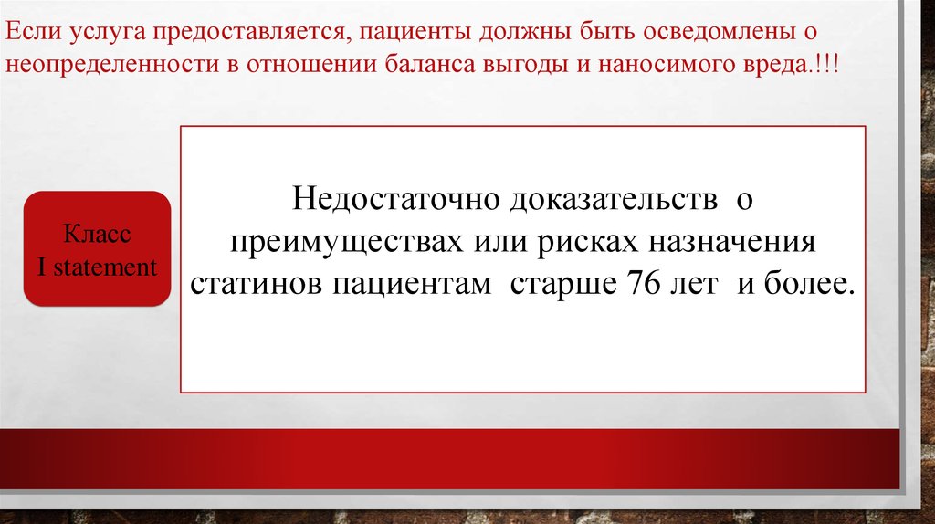 Если услуга предоставляется, пациенты должны быть осведомлены онеопределенности в отношении баланса выгоды и наносимого вреда.!!!