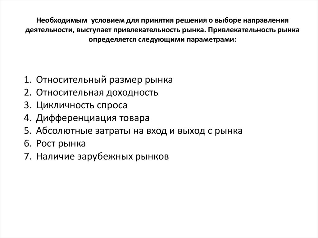 Необходимым условием для принятия решения о выборе направлениядеятельности, выступает привлекательность рынка. Привлекательность рынка