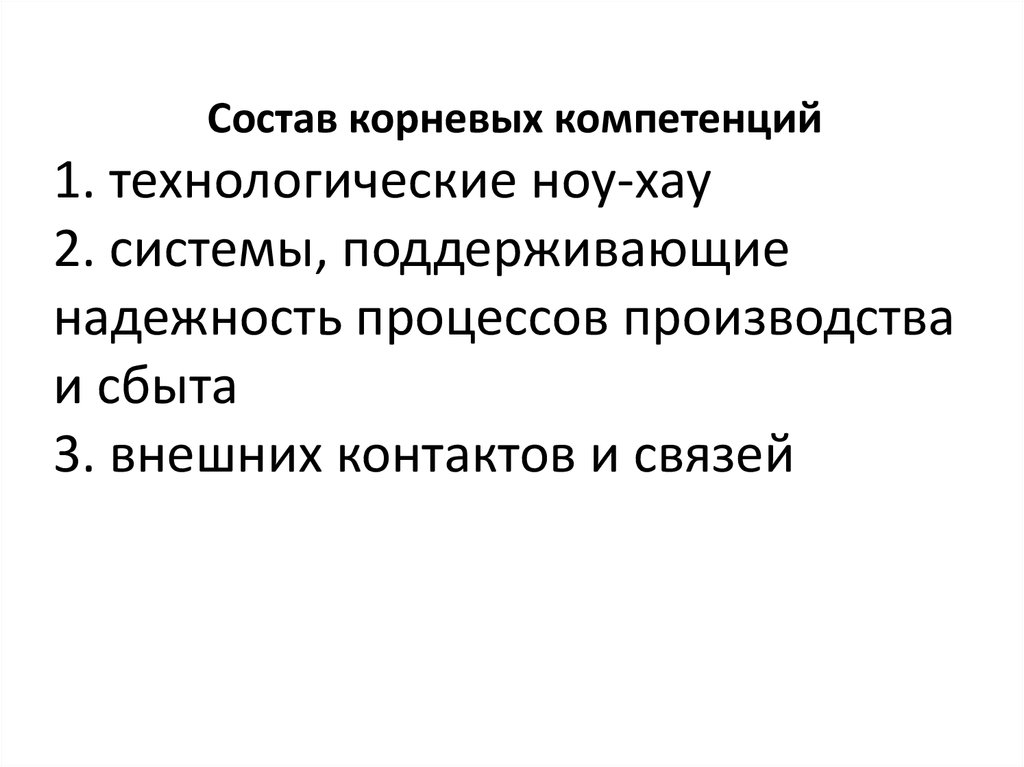 Корневые компетенции – знания, умения и связи фирмы,позволяющие ей добиваться стратегического преимущества