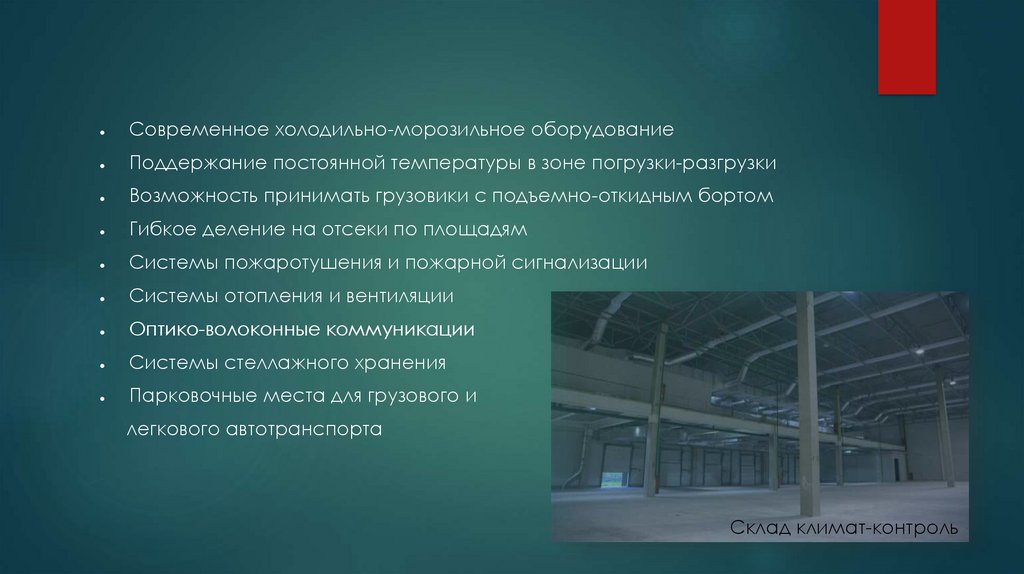 Склад класса А с климат-контролем (температурный режим +15°С): 15 000 кв.м.