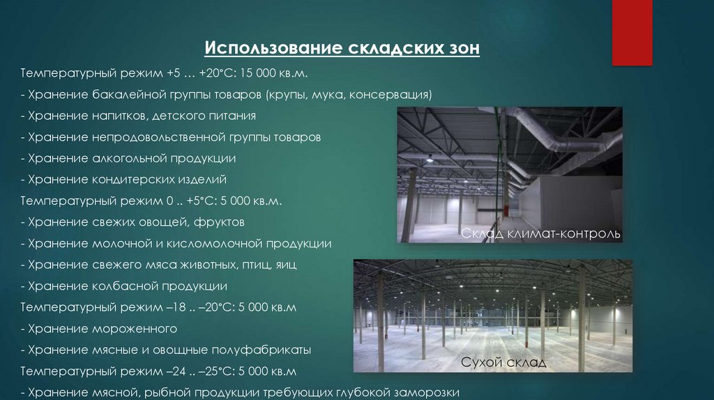 Использование складских зонТемпературный режим +5 … +20°С: 15 000 кв.м.