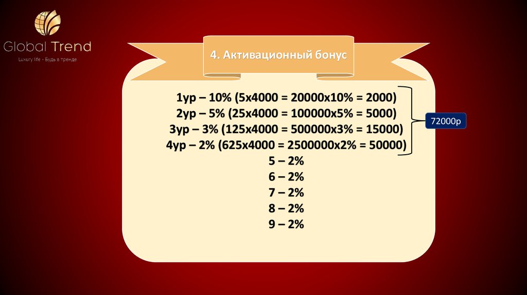 4. Активационный бонус1ур – 10% (5х4000 = 20000х10% = 2000)