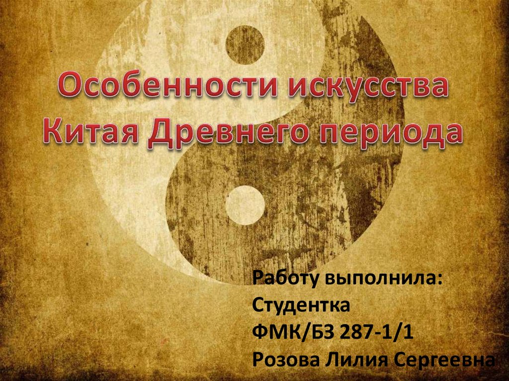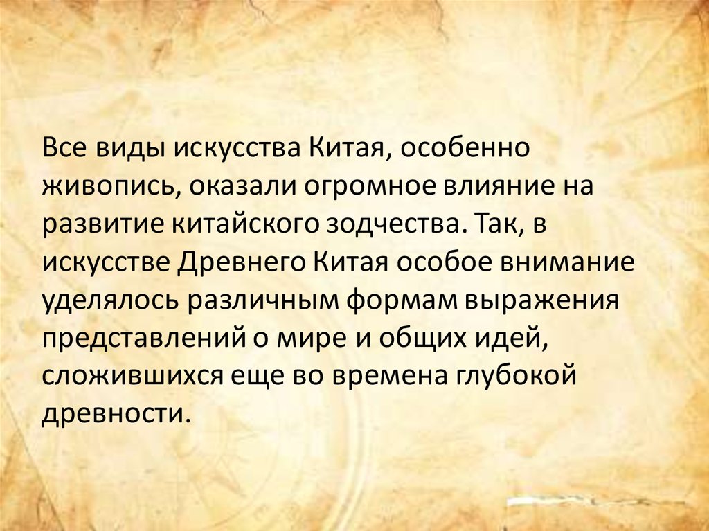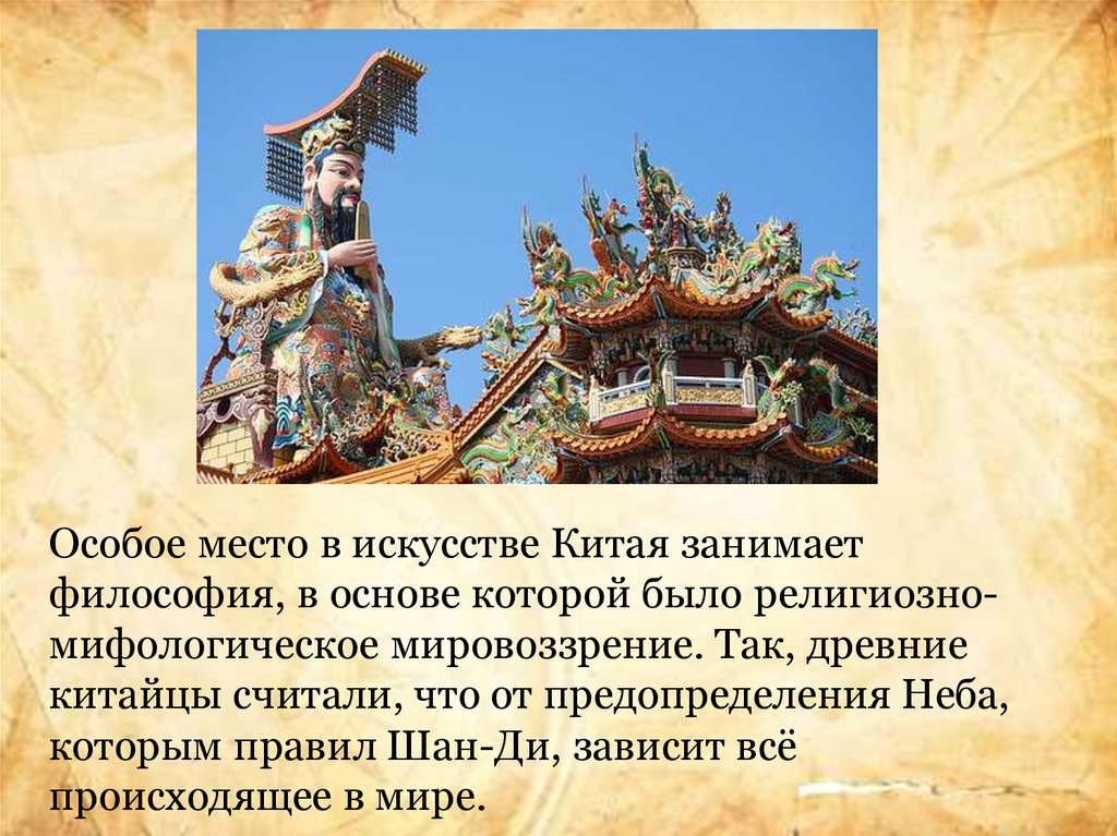 Особое место в искусстве Китая занимаетфилософия, в основе которой было религиозномифологическое мировоззрение. Так, древние