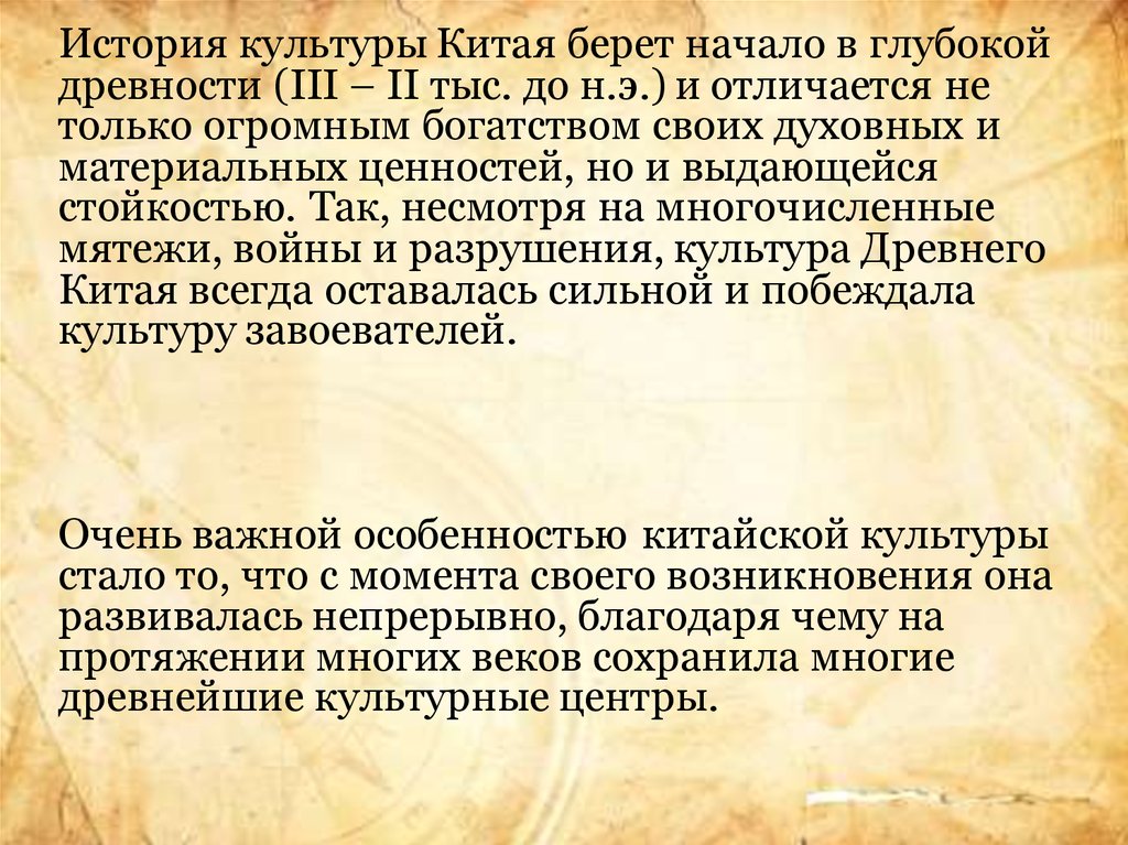 История культуры Китая берет начало в глубокойдревности (III – II тыс. до н.э.) и отличается не
