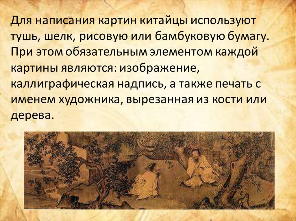 Для написания картин китайцы используюттушь, шелк, рисовую или бамбуковую бумагу.