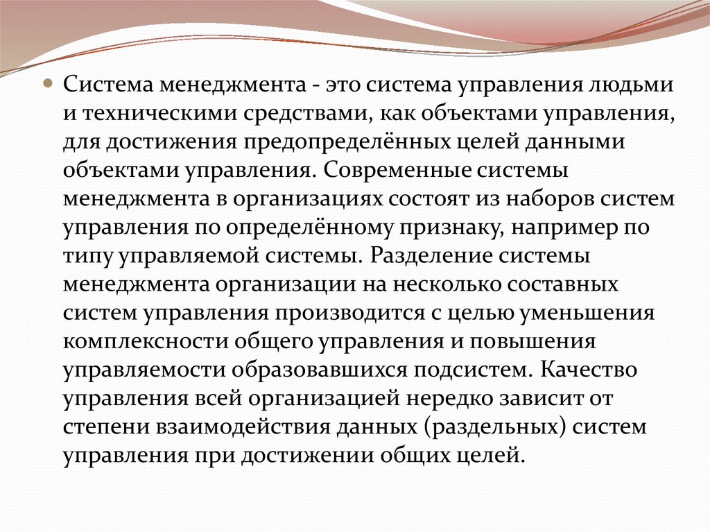 Система менеджмента - это система управления людьмии техническими средствами, как объектами управления,