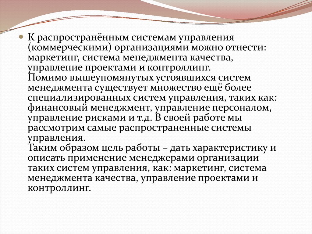 К распространённым системам управления(коммерческими) организациями можно отнести: