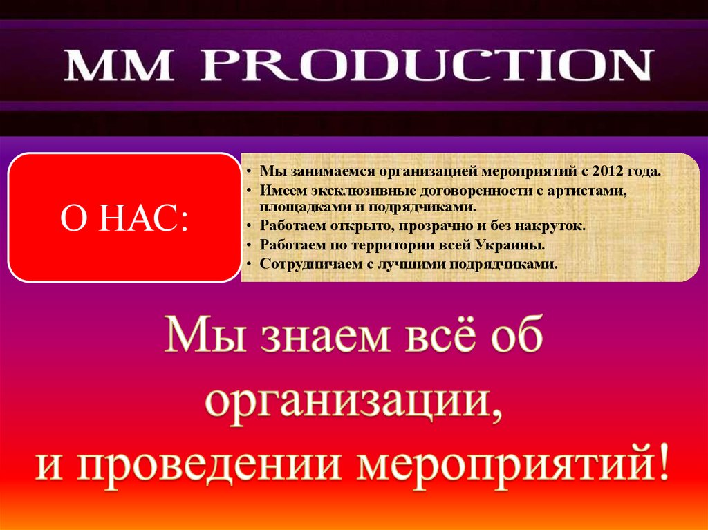 О НАС:• Мы занимаемся организацией мероприятий с 2012 года.