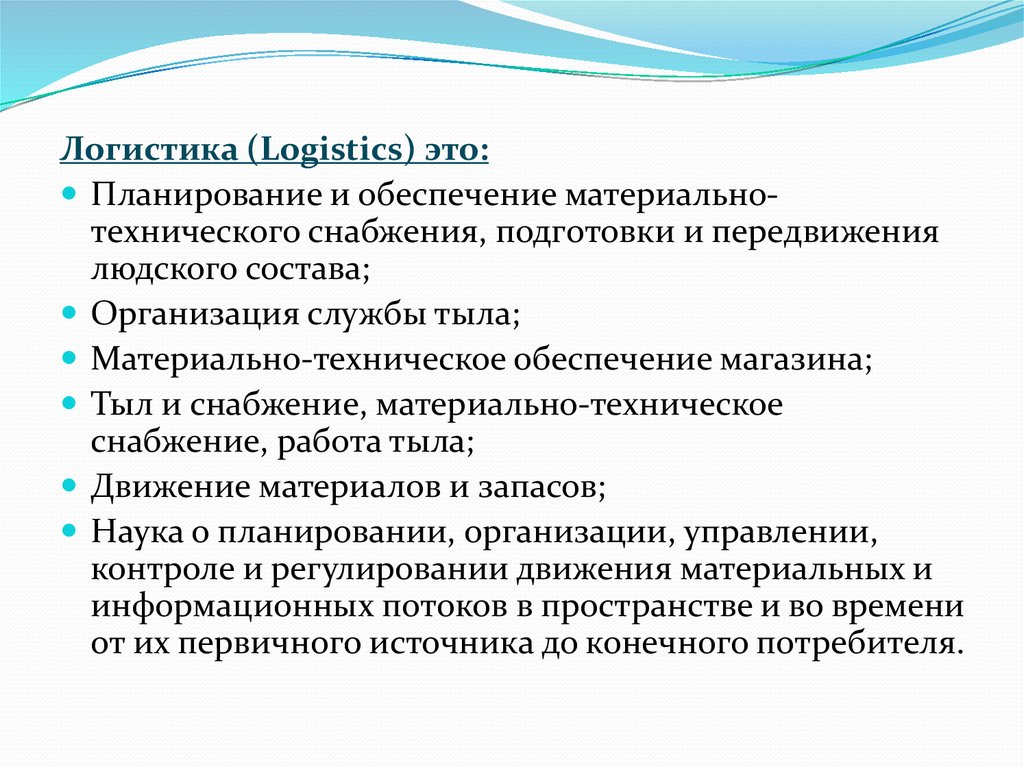 Логистика (Logistics) это:Планирование и обеспечение материальнотехнического снабжения, подготовки и передвижения