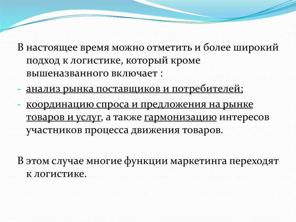 В настоящее время можно отметить и более широкийподход к логистике, который кроме