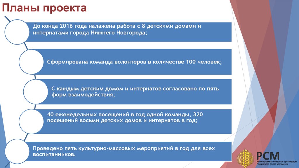 Планы проектаДо конца 2016 года налажена работа с 8 детскими домами и