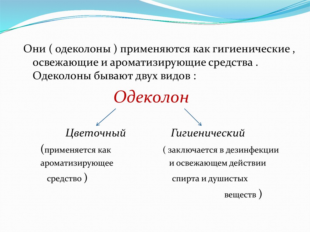 Они ( одеколоны ) применяются как гигиенические ,освежающие и ароматизирующие средства .