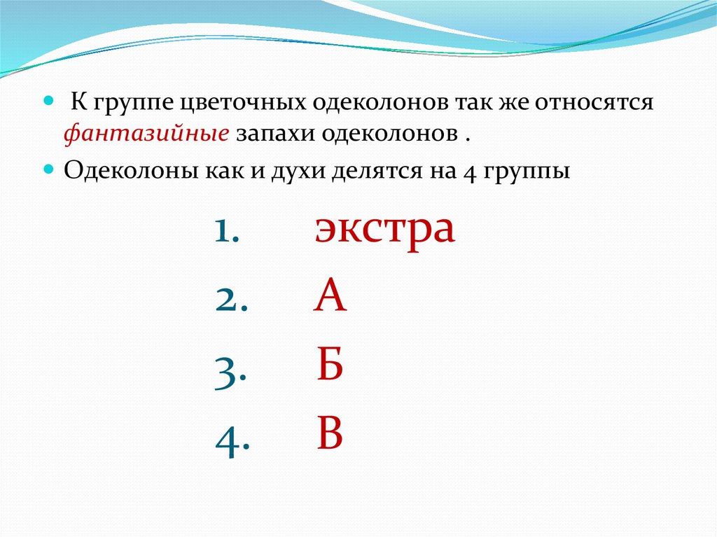 Одеколоны как и духи делятся на 4 группы
