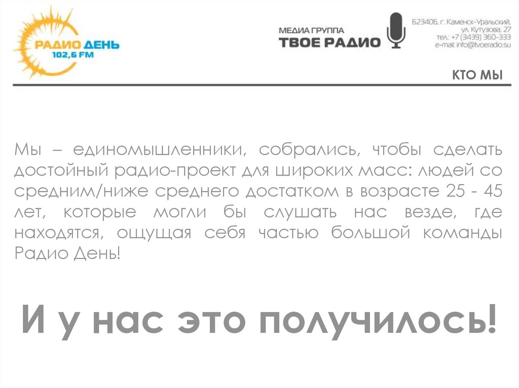 КТО МЫРадио День – это музыкально-развлекательная радиостанция с