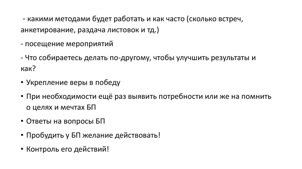 • БП должен уйти с координации и знать чётко, что ему делатькаждый день и верить в свой результат!