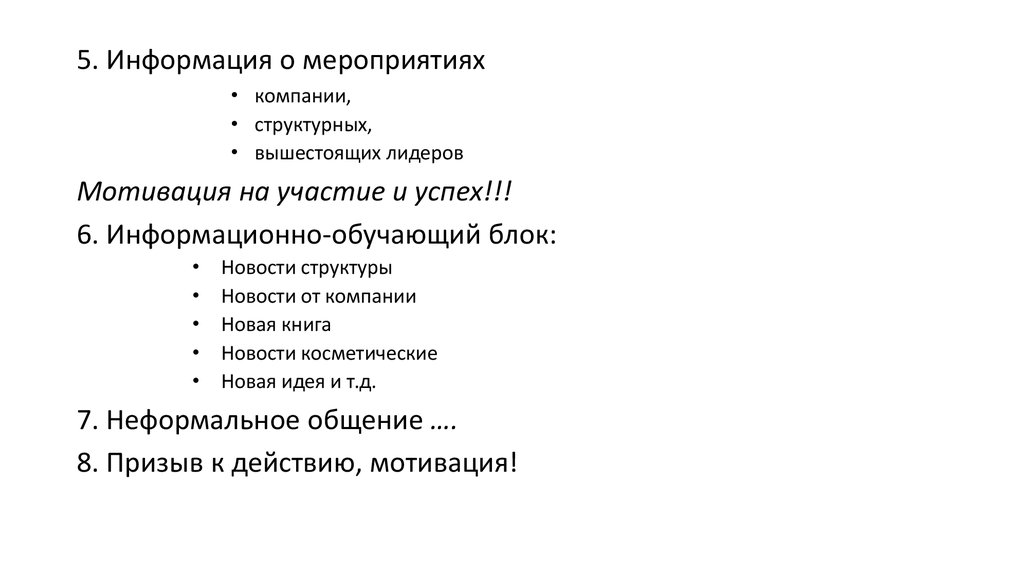 • Неформальное общение (как дела, как неделя и тд)• Просмотреть план на каталог или же скорректировать план, проверить его