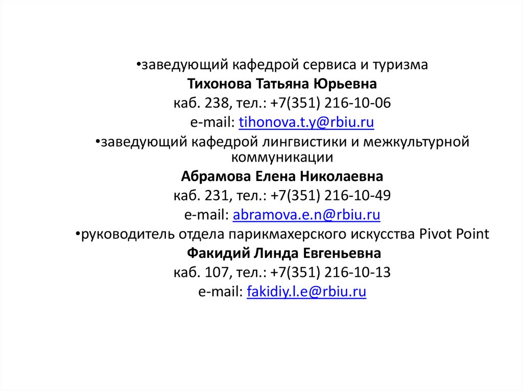•заведующий кафедрой сервиса и туризмаТихонова Татьяна Юрьевна