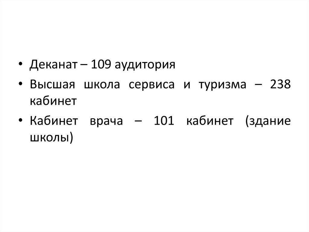 • Деканат – 109 аудитория• Высшая школа сервиса и туризма – 238