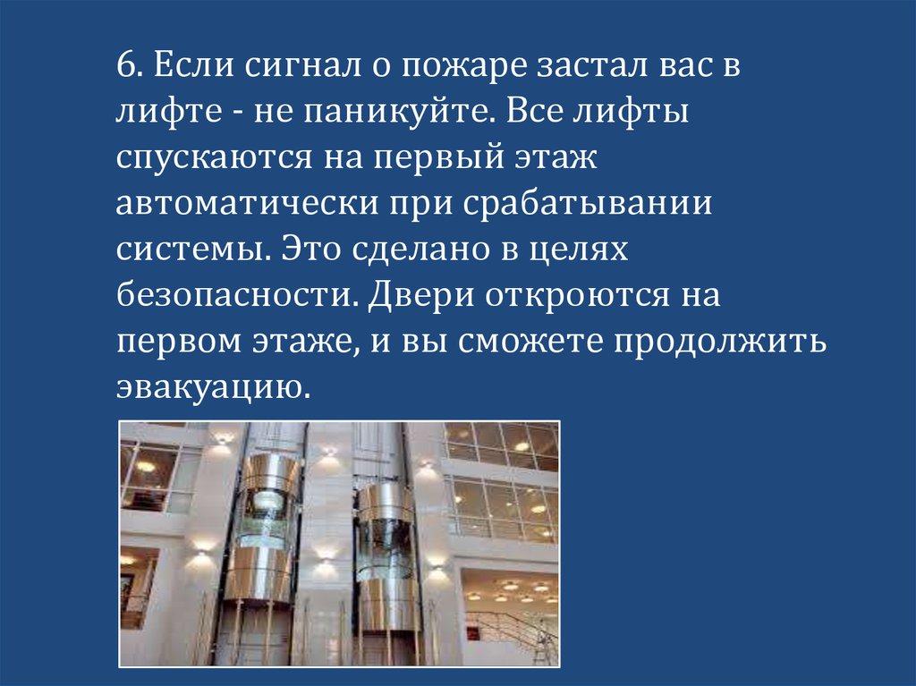 6. Если сигнал о пожаре застал вас влифте - не паникуйте. Все лифты
