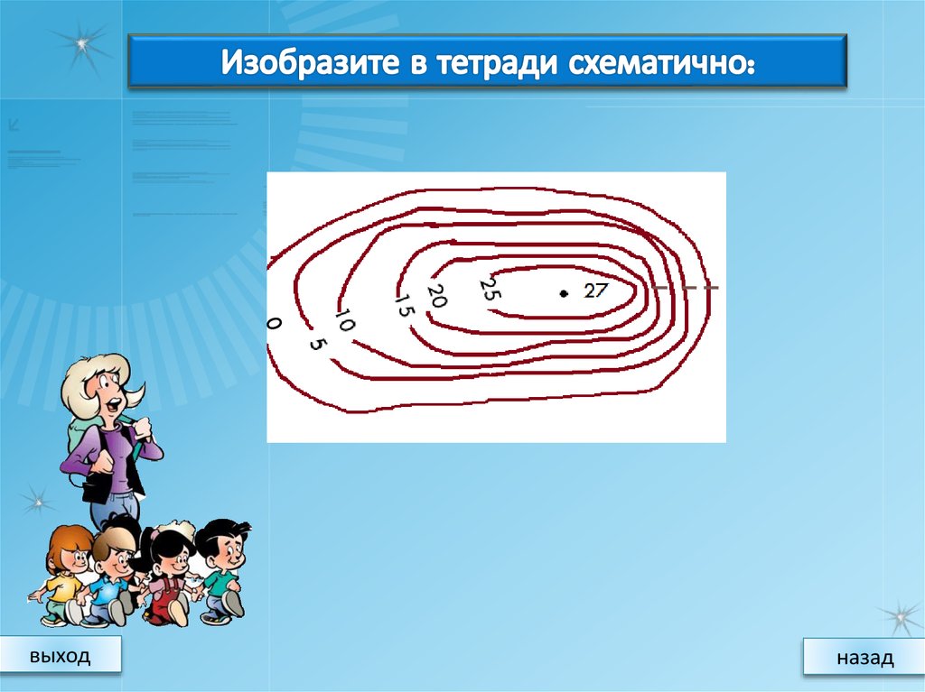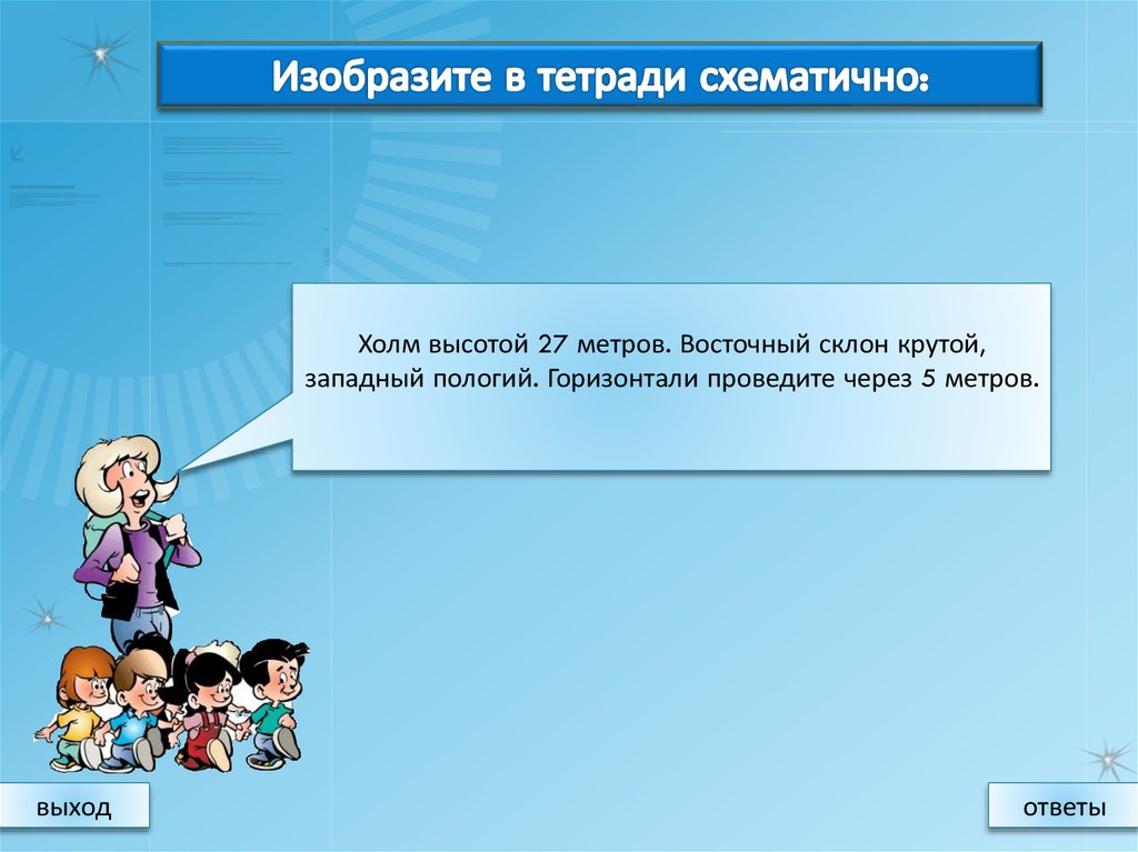 Холм высотой 27 метров. Восточный склон крутой,западный пологий. Горизонтали проведите через 5 метров.