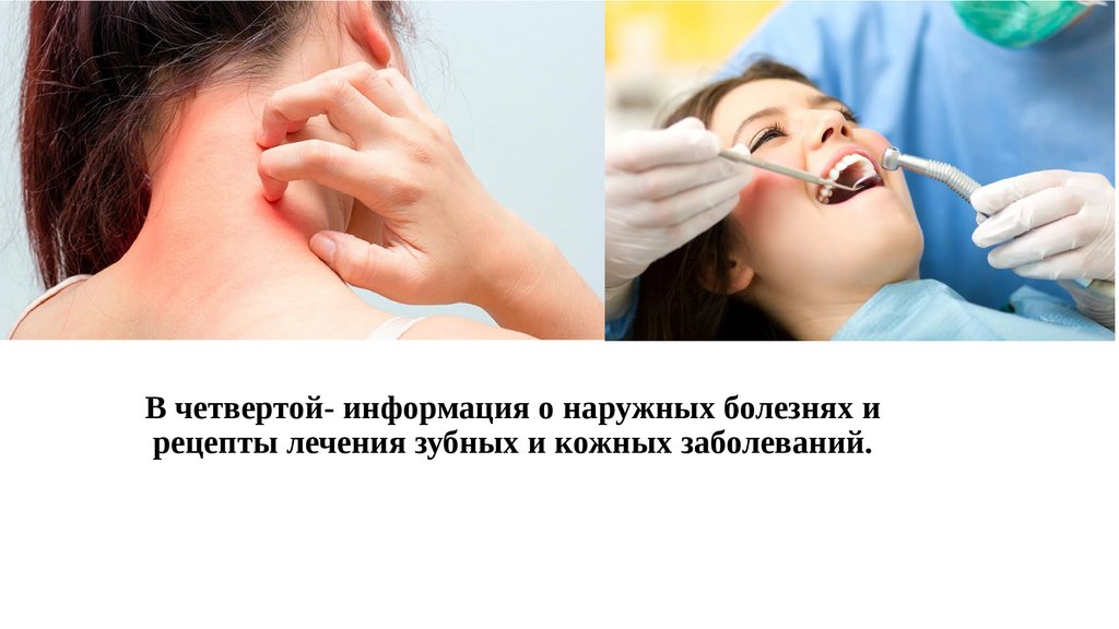 В четвертой- информация о наружных болезнях ирецепты лечения зубных и кожных заболеваний.