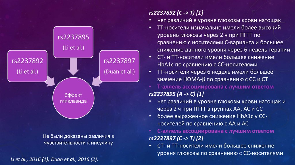 • Эффект гликлазида выше у носителей СС-генотипа по сравнению с носителями СТ + ТТ [6]