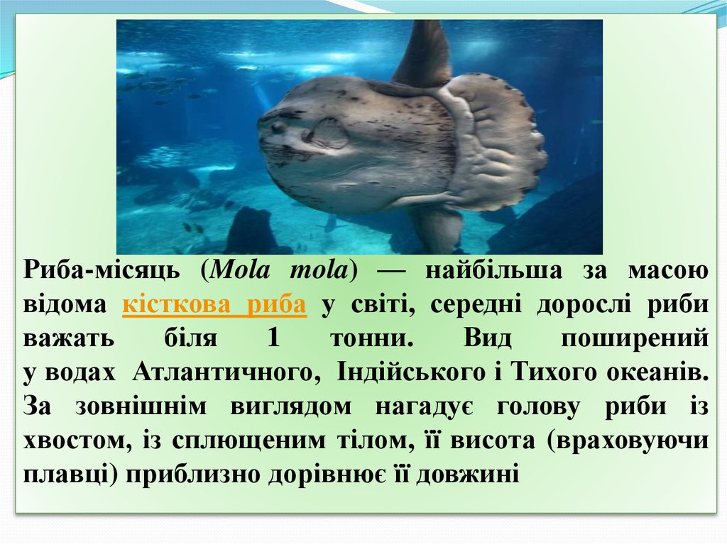 Риба-місяць (Mola mola) — найбільша за масоювідома кісткова риба у світі, середні дорослі риби