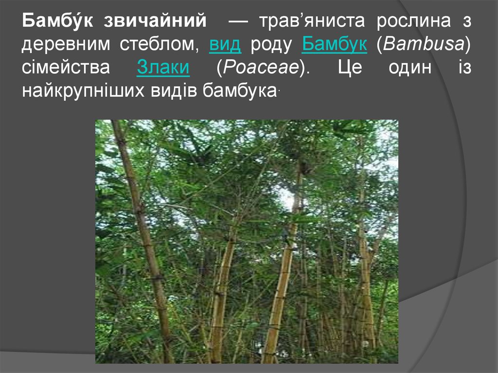 Бамбу́к звичайний — трав’яниста рослина здеревним стеблом, вид роду Бамбук (Bambusa)