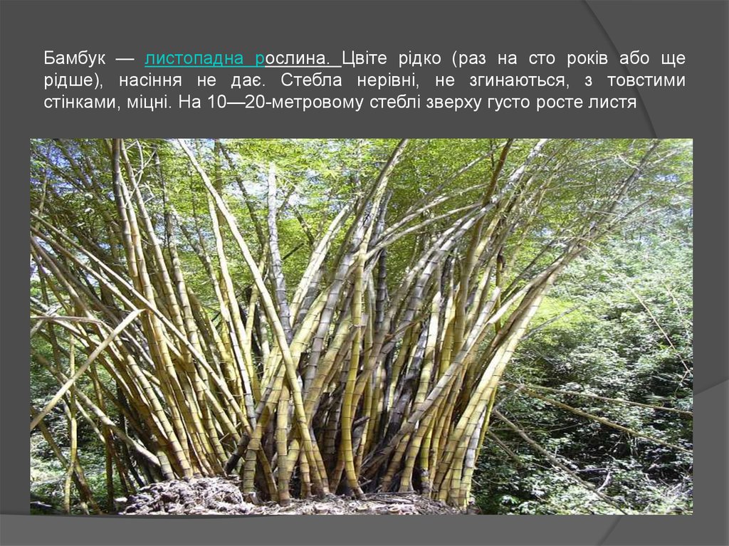 Бамбук — листопадна рослина. Цвіте рідко (раз на сто років або щерідше), насіння не дає. Стебла нерівні, не згинаються, з товстими