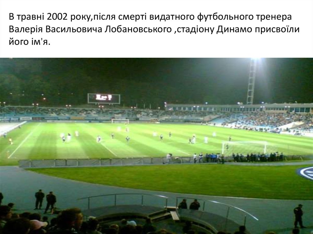 В травні 2002 року,після смерті видатного футбольного тренераВалерія Васильовича Лобановського ,стадіону Динамо присвоїли