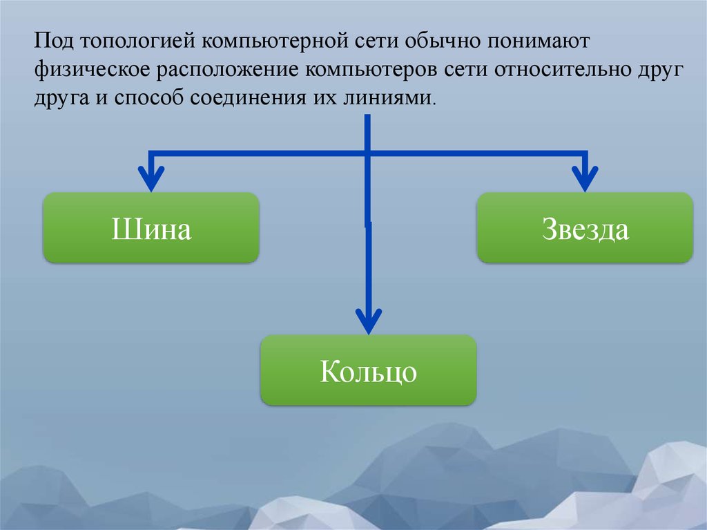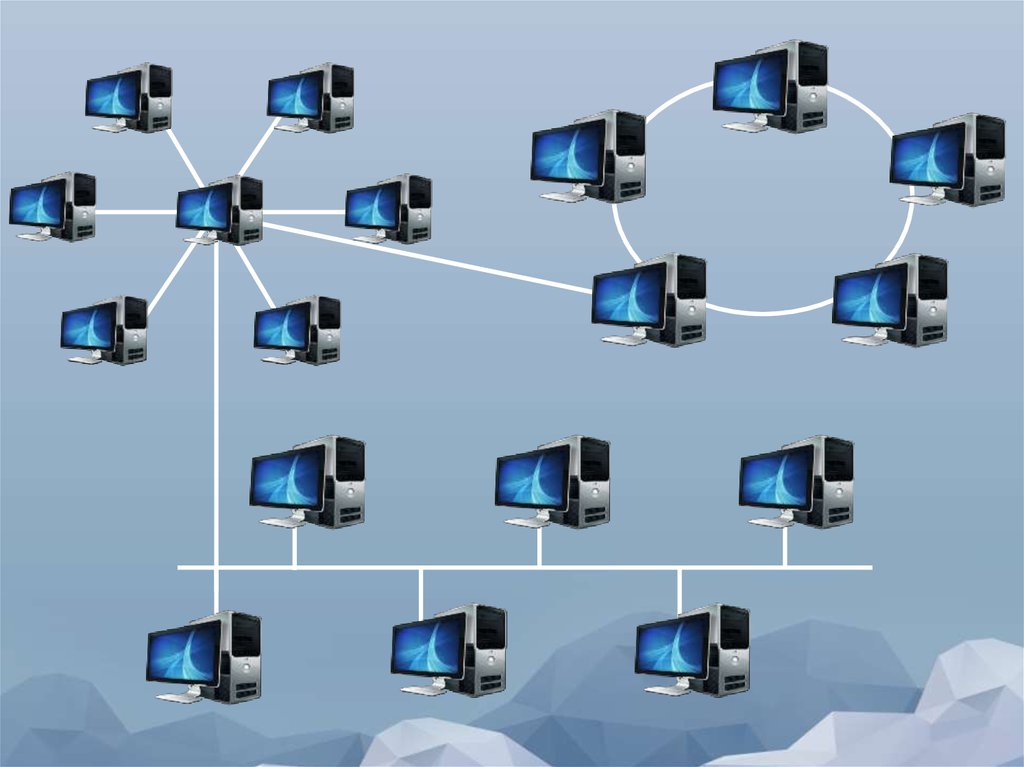 Звезда (star), при которой к одному центральному компьютеруприсоединяются остальные периферийные компьютеры, причем каждый из