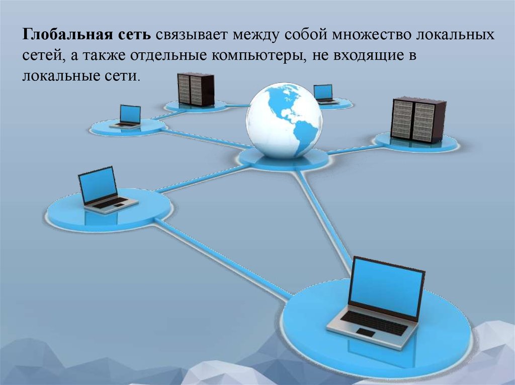 Глобальная сеть связывает между собой множество локальныхсетей, а также отдельные компьютеры, не входящие в